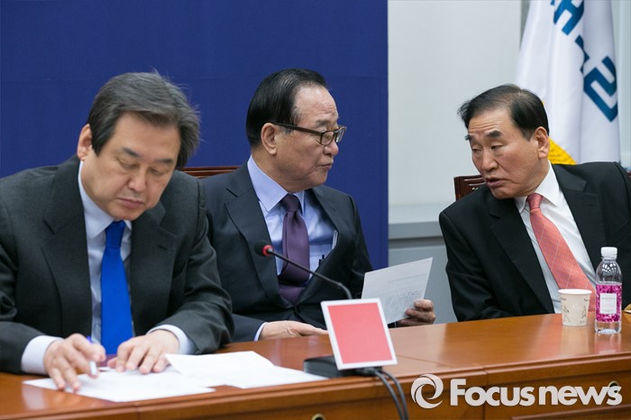 (서울=포커스뉴스) 서청원(가운데) 새누리당 최고위원과 이재오(오른쪽) 의원이 9일 오전 서울 여의도 국회에서 열린 최고중진연석회의에 참석해 대화하는 동안, 김무성 대표가 메모하고 있다.