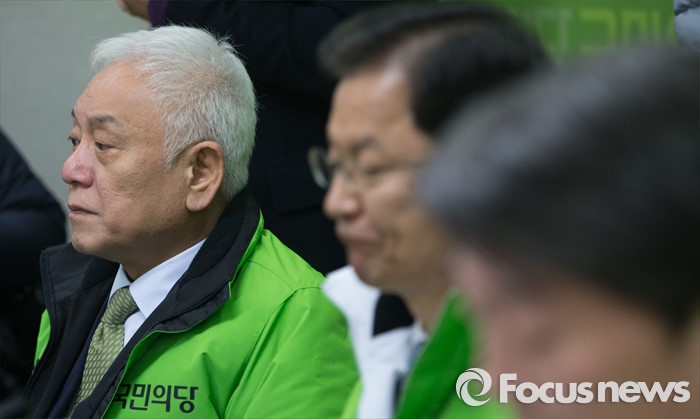 (서울=포커스뉴스) 9일 오전 서울 마포구 국민의당 당사에서 열린 최고위원회의에서 김한길 상임공동선대위원장이 생각에 잠겨 있다. 오른쪽부터 안철수 상임공동대표, 천정배 상임공동대표, 김한길 선대위원장.