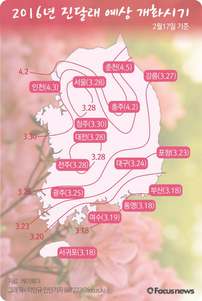 (서울=포커스뉴스) 민간기상기업 케이웨더는 진달래 개화시기는 3월 18일 서귀포를 시작으로 남부지방은 3월 17일~28일, 중부지방 3월 27일~4월 2일 개화할 것으로 보인다고 밝혔다.