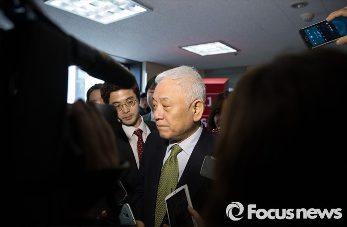 (서울=포커스뉴스) 9일 오전 서울 마포구 국민의당 당사에서 선거대책회의를 마친 김한길 상임공동 선거대책위원장이 기자들로부터 야권통합, 야권연대에 관한 질문을 받고 있다.
