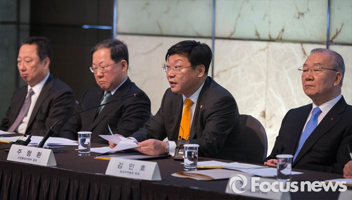(서울=포커스뉴스) 주형환(왼쪽 세번째) 산업통상자원부 장관이 9일 오전 서울 중구 플라자호텔에서 열린 '2016 경제단체협의회 정기총회'에 참석, 축사를 하고 있다.