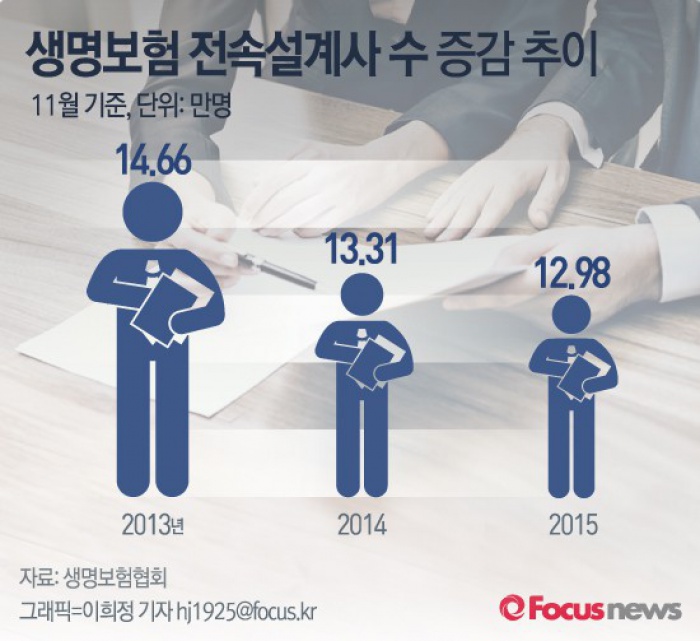 (서울=포커스뉴스) 23개 생명보험사의 전속설계사가 매년 줄어들고 있다. 2013년 14만6595명이었던 생보사 전속설계사 수는 2014년 13만3061명, 2015년 12만9846명으로 2013년과 2015년을 비교했을때 11%가량(1만6749명)줄었다.