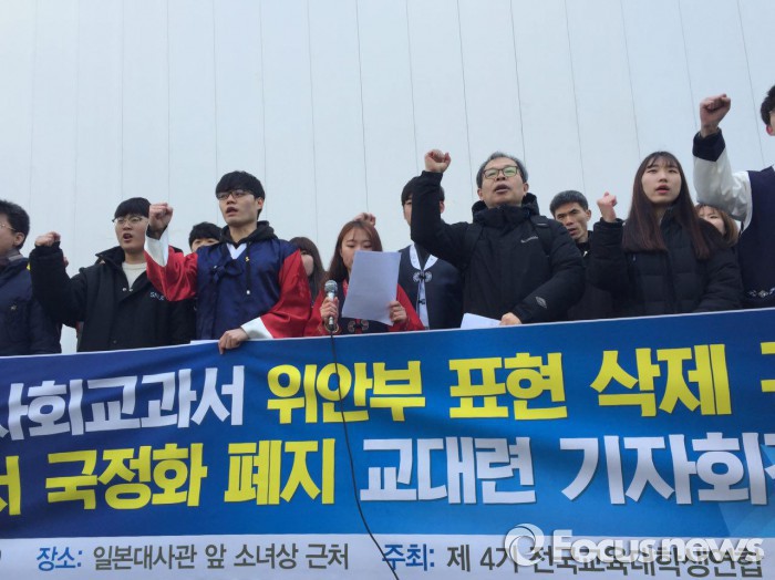 (서울=포커스뉴스) 전국교육대학생연합(교대련)이 초등학교 6학년 사회교과서 내 '위안부' 표현 삭제에 대해 규탄했다.