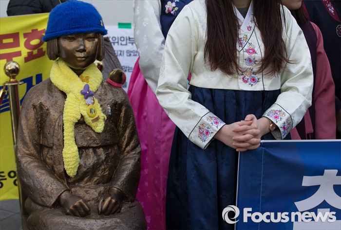 (서울=포커스뉴스) 9일 오전 서울 종로구 옛 주한일본대사관 앞에서 전국교육대학생연합 회원들이 '초등 6학년 사회교과서 위안부 표현 삭제 규탄, 역사교과서 국정화 폐지 교대련 기자회견'을 하고 있다.