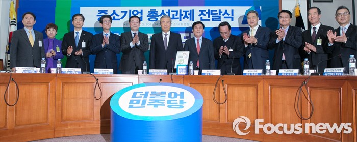 (서울=포커스뉴스) 김종인(왼쪽 다섯번째) 더불어민주당 비대위 대표가 9일 오후 서울 여의도 국회에서 열린 중소기업중앙회 회장단 총선과제 전달식에 참석해 박성택(오른쪽 여섯번째) 중소기업중앙회장으로부터 과제를 전달받은 뒤 참석자들과 함께 취재진을 향해 포즈를 취하고 있다.