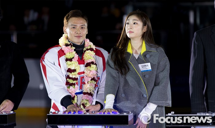 (춘천=포커스뉴스) 9일 오후 강원 춘천의암빙상장에서 제2회 2018 평창 패럴림픽 데이에 참석한 평창동계올림픽 홍보대사 김연아와 패럴림픽 홍보대사 정승환 선수가 선포 세리머니를 하고 있다.