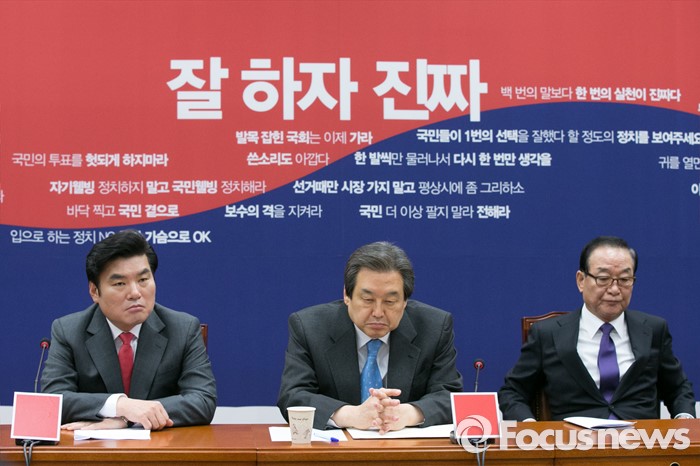 앞서 지난 8일 정의화 국회의장은 원유철 새누리당 원내대표를 비롯한 156인의 집회 요구로 3월 임시국회를 오는 11일부터 소집한다고 공고했다.(서울=포커스뉴스) 김무성(가운데) 새누리당 대표와 원유철(왼쪽) 원내대표, 서청원 최고위원이 7일 오전 서울 여의도 국회에서 열린 최고위원회의에 참석해 자리에 앉아 있다. 2016.03.07 박철중 기자
