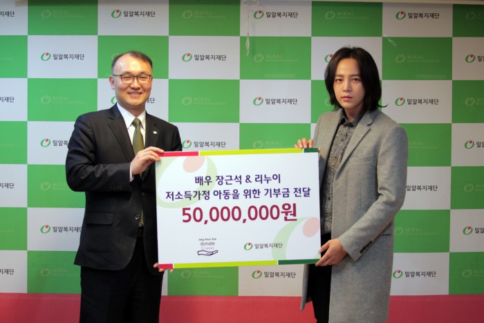 소속사 트리제이컴퍼니는 9일 "장근석은 지난 5일 밀알복지재단에서 진행된 기부금 전달식에 참석했다"고 밝혔다. 장금석은 지난달 21일 가방 브랜드 '리누이'와 함께 자선 바자회를 열어 애장품 200여 점을 내놓았다. 수익금 전부는 장애 아동과 청소년 10명의 수술비 및 재활치료비에 사용된다.