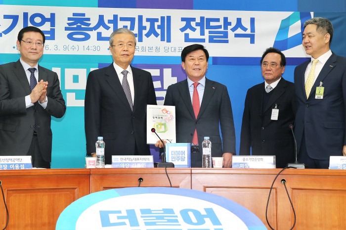 박성택 중기중앙회장은 "그간 지속돼 온 수출 대기업 중심 자원분배와 경제성장의 결과 경제주체 간 이중구조가 고착화되고, 우리 경제의 성장동력이 약화되고 있다"며 "시장의 공정성 회복, 왜곡된 자원분배 개선 등 중소기업 현장의 목소리가 더민주당 총선공약에 적극 반영돼 중소기업 중심 경제로의 전환을 위한 법적·제도적 기반이 마련되길 기대한다"고 밝혔다.박성택 중기중앙회장(왼쪽 3번째)가 중소기업계를 대표해 더민주당 김종인 대표(왼쪽 2번째)에게 '중소기업 활력 회복을 위한 정책과제'를 전달하고 있다.<사진제공=중기중앙회>