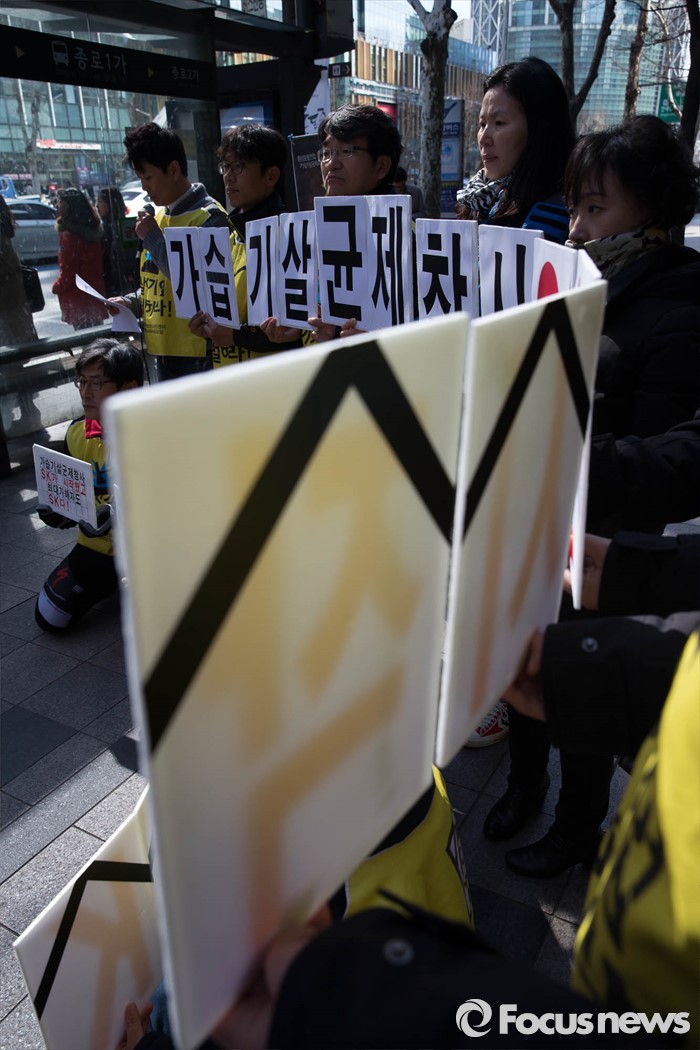 (서울=포커스뉴스) 9일 오전 서울 종로구 SK서린빌딩 앞에서 환경보건시민센터 회원들이 가습기살균제 사용 피해 책임을 요구하며 SK케미칼 전ㆍ현직 임원들의 처벌을 촉구하고 있다.