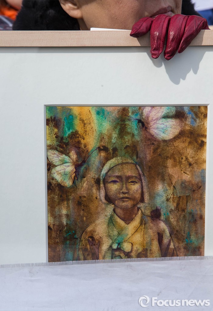 (서울=포커스뉴스) 9일 오후 서울 종로구 구 일본대사관 앞에서 열린 일본군 '위안부' 문제해결을 위한 제1221차 정기 수요집회에서 한 참가자가 위안부 소녀상 그림을 들고 있다.