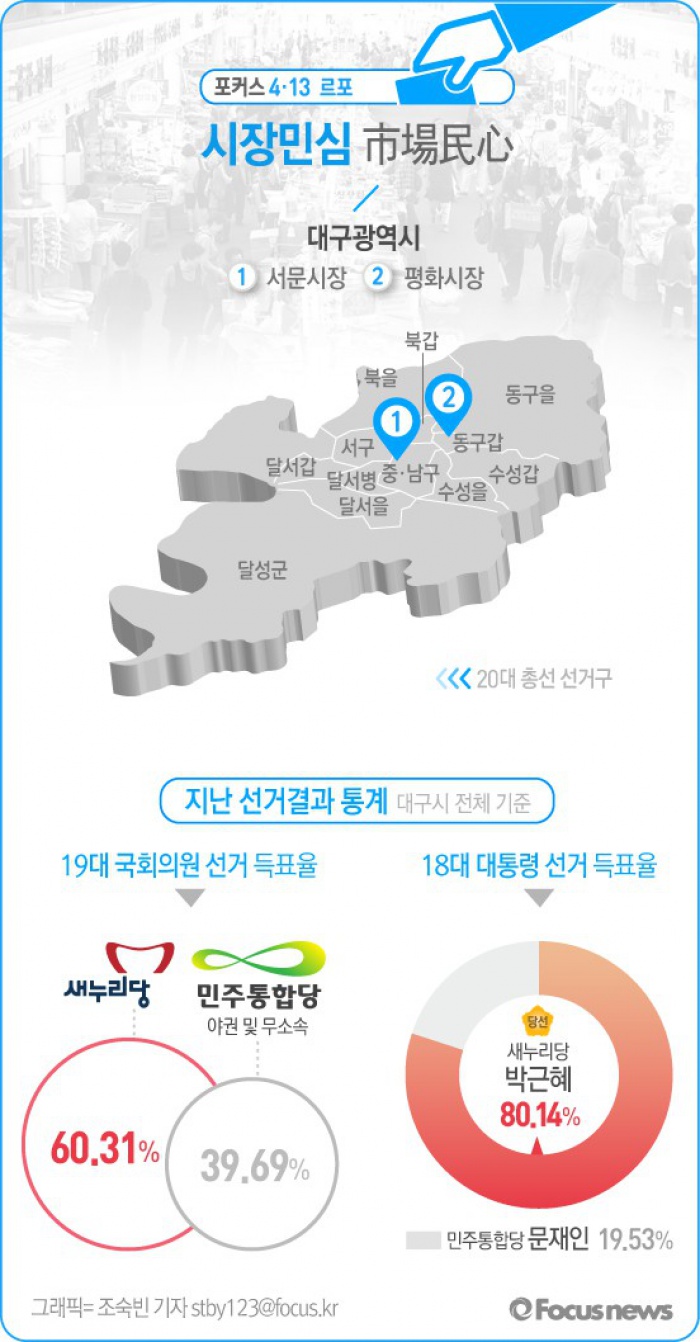 (서울=포커스뉴스) 지난 8일 박 대통령의 정치적 고향이자 텃밭으로 불리는 대구의 최대 전통시장 '서문시장'과 '평화시장'의 지난 선거의 표심을 알아봤다.