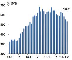 2월말에는 중국 위안화 예금의 감소세가 두드러졌다. 2월말 위안화 예금은 전월 말 대비 6000만달러가 줄어든 43억4000만달러로 역대 최고치를 기록했던 217억달러에 비해 5분의 1 수준으로 급감했다. 위안화 예금은 2013년 11월말(41억7000만달러) 이후 최저 수준이다.