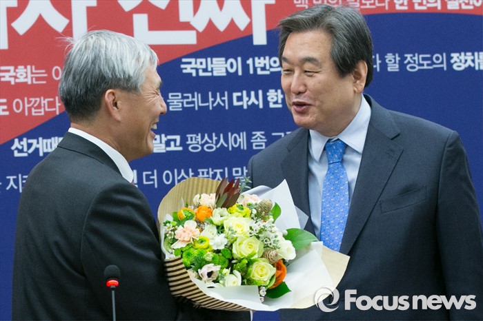 (서울=포커스뉴스) 프로바둑 조훈현(왼쪽) 9단이 10일 오전 서울 여의도 국회 새누리당 대표최고위원실에서 열린 입당식에 참석해 김무성 대표와 악수하고 있다.