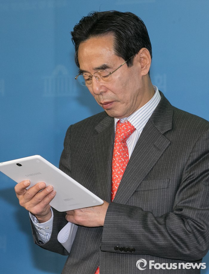(서울=포커스뉴스) 홍창선 더불어민주당 공천관리위원장이 10일 오전 서울 여의도 국회 정론관에서 김성수 대변인이 20대 총선 경선 및 단수지역과 2차 공천배제(컷오프) 명단 발표를 하고 있는 동안 태블릿PC를 살펴보고 있다.