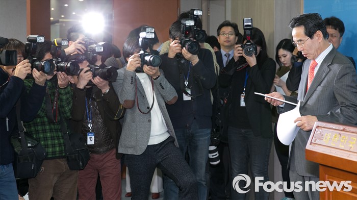 (서울=포커스뉴스) 홍창선 더불어민주당 공천관리위원장이 10일 오전 서울 여의도 국회 정론관에서 김성수 대변인이 20대 총선 경선 및 단수지역과 2차 공천배제(컷오프) 명단 발표를 하고 있는 동안 태블릿PC를 살펴보고 있다.