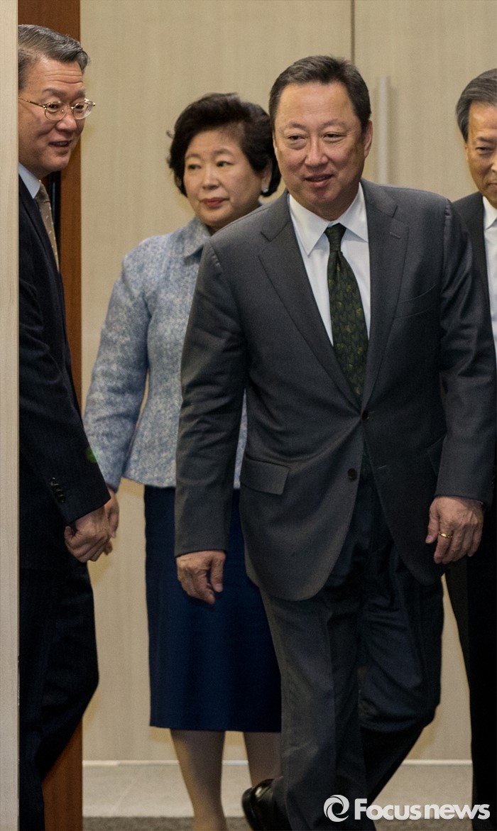 (서울=포커스뉴스) 10일 오전 서울 중구 대한상공회의소에서 열린 국세청장 초청 전국상의 회장단 정책간담회에 참석한 임환수 국세청장(왼쪽부터), 현정은 현대그룹 회장, 박용만 대한상의 회장이 간담회장으로 발걸음을 옮기고 있다.