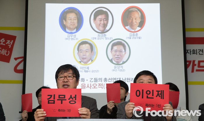 (서울=포커스뉴스) 10일 오전 서울 종로구 참여연대에서 열린 '경제민주화 을(乙)들의 총선연대 집중 낙천리스트 발표 기자회견'에서 을(乙)총선연대, 참여연대를 비롯한 시민단체 회원들이 구호를 외치고 있다.