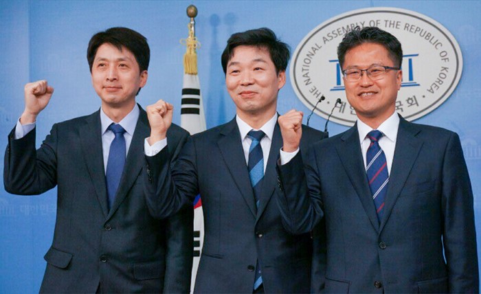 (서울=포커스뉴스) 10일 오전 서울 여의도 국회 정론관에서 더불어민주당 김병관(가운데) 경기 분당갑 예비후보, 김정우(오른쪽) 경기 군포갑 예비후보, 오기형 서울 도봉을 예비후보가 20대 총선 출마선언 후 파이팅을 외치고 있다. <사진제공=김병관 후보 사무소>