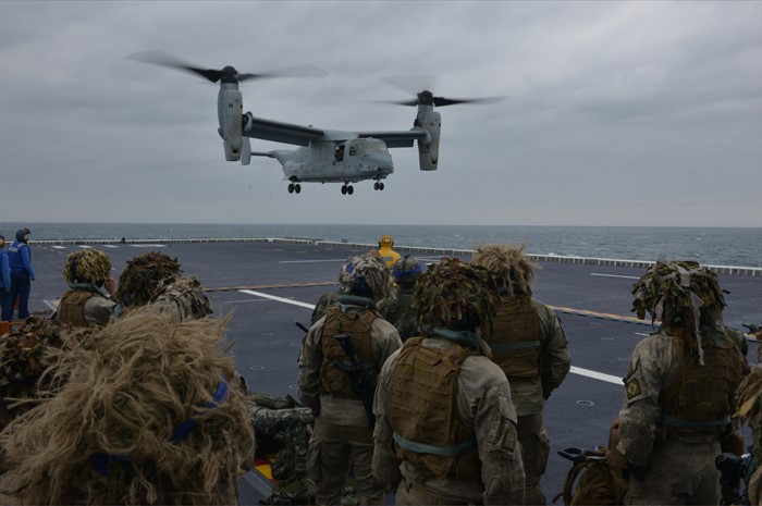 (서울=포커스뉴스) 2016년 쌍룡훈련에 참가한 뉴질랜드 육군 장병들이 지난 9일 독도함에서 미 해병대 MV-22 오스프리를 이용한 공중돌격훈련을 하고 있다. <사진제공=해군>
