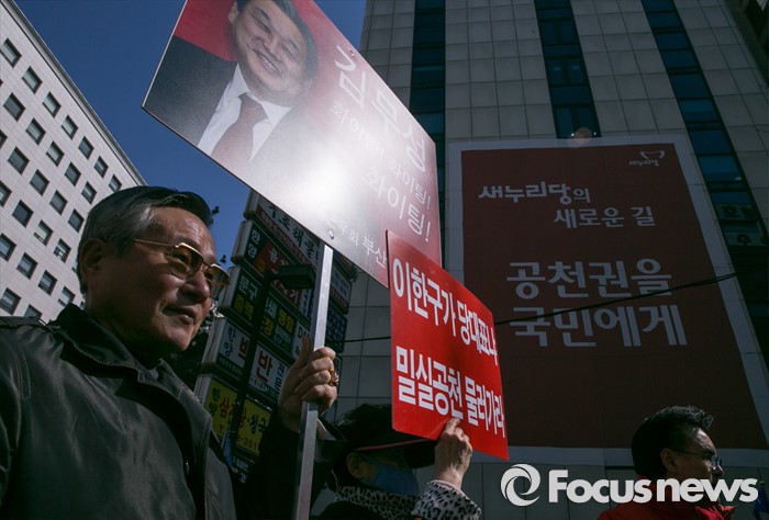 (서울=포커스뉴스) 10일 오후 서울 여의도 새누리당사 앞에서 부산에서 상경한 김무성 대표 지지자들이 윤상현 의원 징계 등을 촉구하는 집회를 하고 있다.