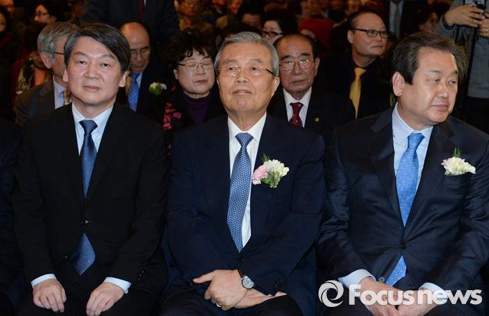 (서울=포커스뉴스) 김무성(오른쪽부터) 새누리당 대표, 김종인 더불어민주당 비대위 대표, 안철수 국민의당 상임공동대표가 10일 오후 서울 종로구 세종문화회관 세종홀에서 열린 김종필 전 국무총리의 정치인생을 담은 '김종필 증언록' 출판기념회에 참석해 자리하고 있다.