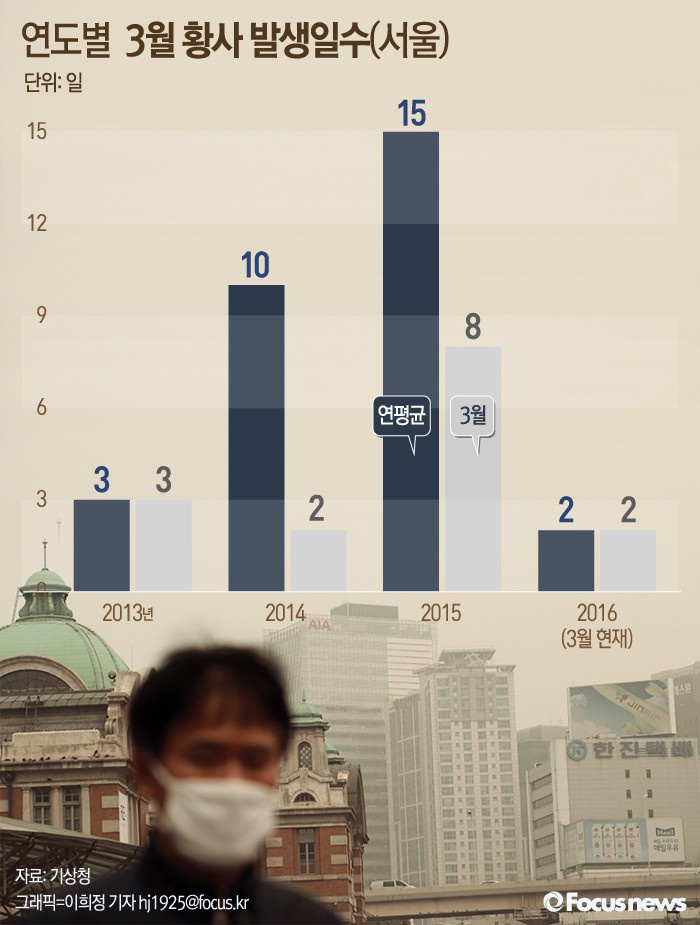 (서울=포커스뉴스) 기상청 자료에 따르면 1년 중 황사 발생 빈도가 가장 높은 달은 3월로 나타났다. 특히 2015년은 3월에 발생한 황사일수가 연평균 황사 발생일수의 절반 이상인 8일로 관측됐다.