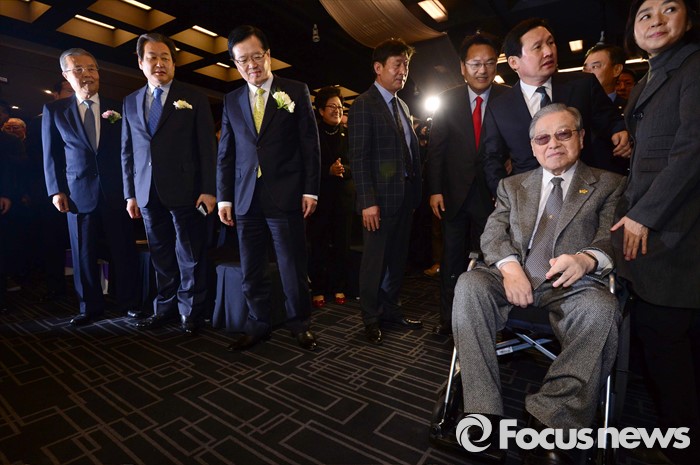 (서울=포커스뉴스) 정의화(왼쪽 세번째) 국회의장, 김무성(왼쪽 두번째) 새누리당 대표, 김종인(왼쪽 첫번째) 더불어민주당 비대위 대표가 10일 오후 서울 종로구 세종문화회관 세종홀에서 열린 김종필 전 국무총리의 정치인생을 담은 '김종필 증언록' 출판기념회에 참석해 김 전 총리를 맞이하고 있다.