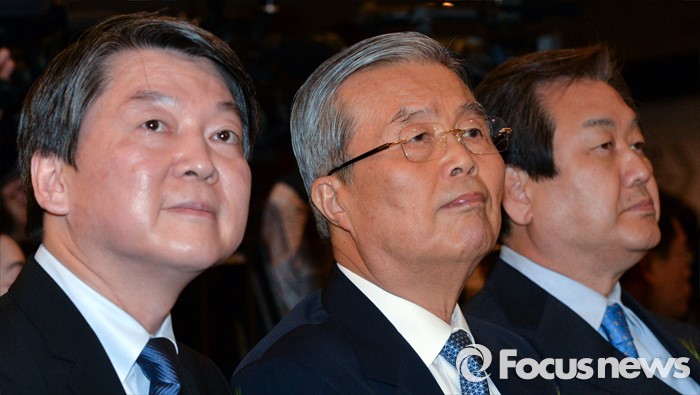 (서울=포커스뉴스) 김무성(오른쪽부터) 새누리당 대표, 김종인 더불어민주당 비대위 대표, 안철수 국민의당 상임공동대표가 10일 오후 서울 종로구 세종문화회관 세종홀에서 열린 김종필 전 국무총리의 정치인생을 담은 '김종필 증언록' 출판기념회에 참석해 자리하고 있다.