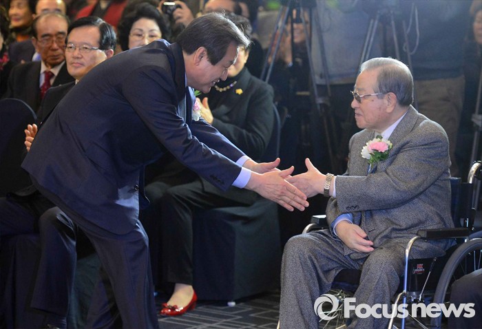 (서울=포커스뉴스) 김무성(왼쪽) 새누리당 대표가 10일 오후 서울 종로구 세종문화회관 세종홀에서 열린 김종필 전 국무총리의 정치인생을 담은 '김종필 증언록' 출판기념회에 참석해 김 전 총리와 인사하고 있다.