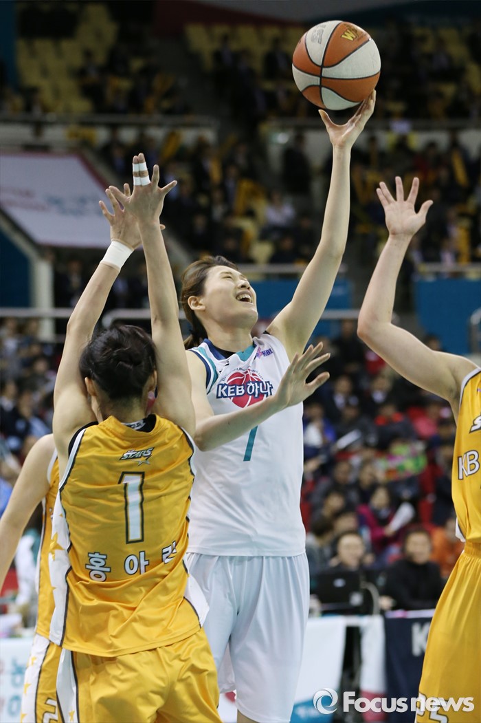 (부천=포커스뉴스) 10일 부천체육관에서 열린 2015-2016 여자프로농구 PO 1차전 KEB하나-KB스타즈 경기에서 KEB하나 강이슬이 KB스타즈 홍아란과 햄비의 수비 사이로 레이업슛을 시도하고 있다.