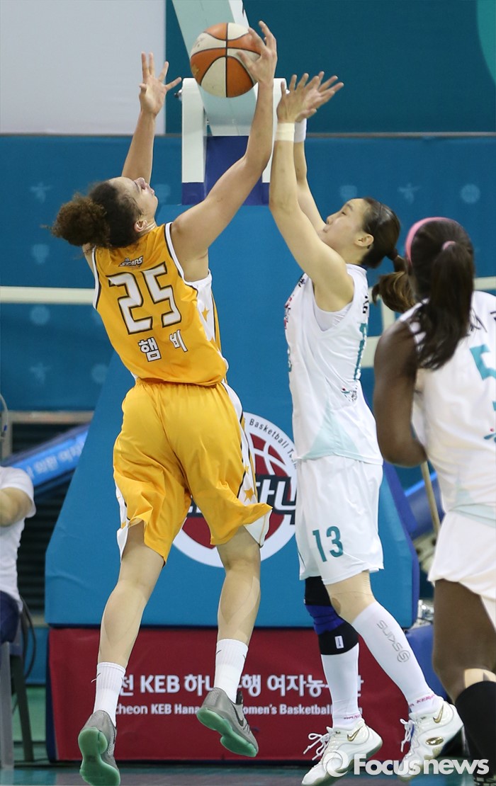 (부천=포커스뉴스) 10일 부천체육관에서 열린 2015-2016 여자프로농구 PO 1차전 KEB하나-KB스타즈 경기에서 KEB하나 김정은과 KB스타즈 햄비가 리바운드를 다투고 있다.