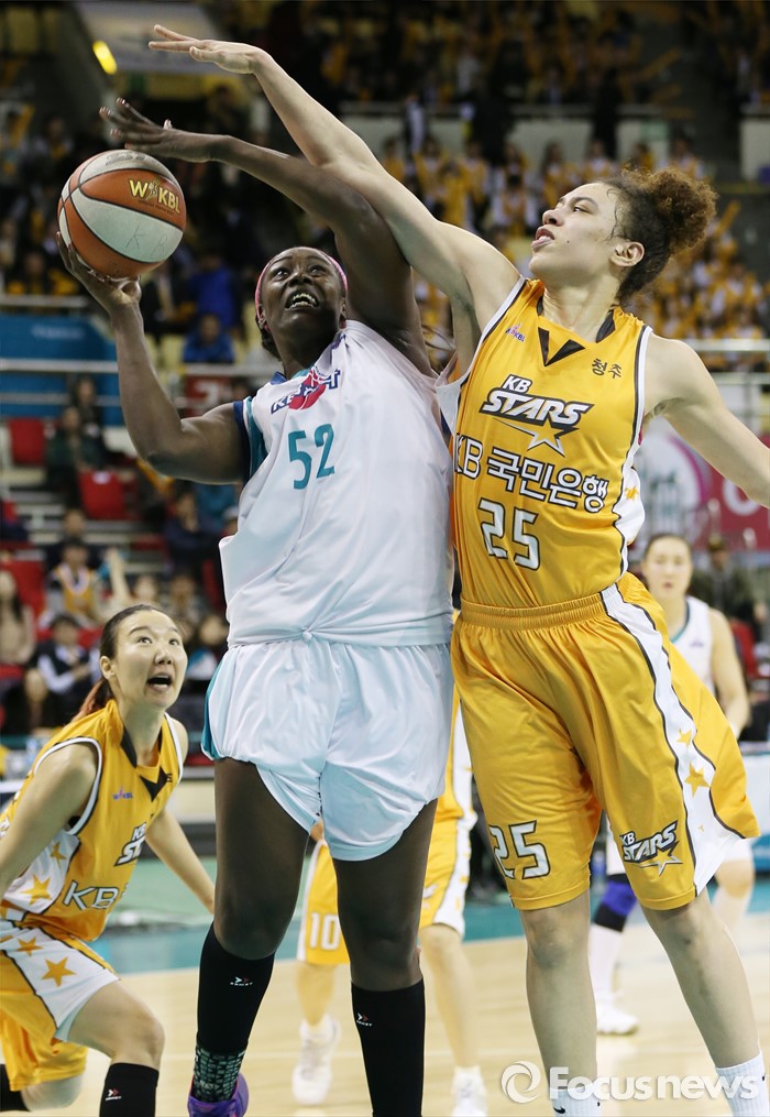 (부천=포커스뉴스) 10일 부천체육관에서 열린 2015-2016 여자프로농구 PO 1차전 KEB하나-KB스타즈 경기에서 KEB하나 첼시 리가 KB스타즈 햄비의 블록을 제치며 골밑슛을 시도하고 있다.