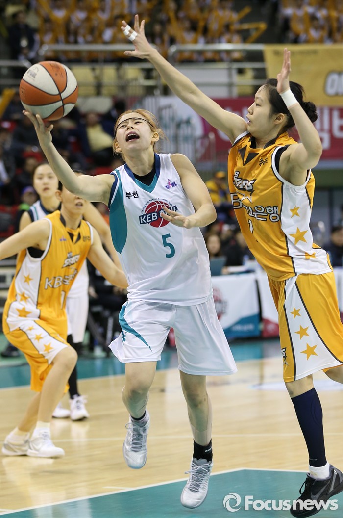 (부천=포커스뉴스) 10일 부천체육관에서 열린 2015-2016 여자프로농구 PO 1차전 KEB하나-KB스타즈 경기에서 KEB하나 김이슬이 KB스타즈 홍아란의 블록을 피해 레이업슛을 시도하고 있다.