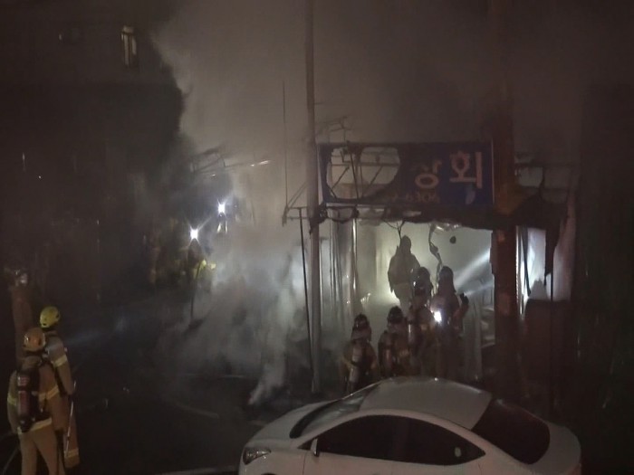 경찰과 소방당국은 가게 앞 적재물에서 불이 시작된 것으로 보고 정확한 원인을 조사 중이다.10일 오후 7시 30분쯤 서울 동대문구 제기동 경동시장 상점에서 화재가 발생해 소방대원들이 진압하고 있다. <사진제공=서울 동대문소방서>