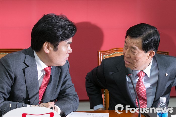 (서울=포커스뉴스) 원유철(왼쪽) 새누리당 원내대표와 황진하 사무총장이 11일 오전 서울 여의도 국회에서 열린 원내대책회의에 참석해 대화하고 있다. 앞서, 지난 10일 황 사무총장은 이한구 공관위원장이 독선적으로 공관위를 운영한다며 회의 불참을 선언했다.