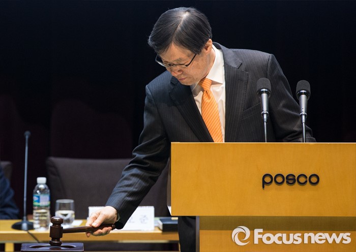 (서울=포커스뉴스) 11일 오전 서울 강남구 포스코센터에서 열린 정기주주총회에 참석한 권오준 포스코 회장이 의사봉을 두드리며 개회를 선언하고 있다.
