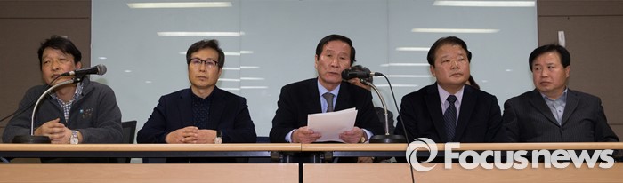 (서울=포커스뉴스) 11일 오전 서울 영등포구 중소기업중앙회 중회의실에서 정기섭(가운데) 회장을 비롯한 임원들이 북한당국의 개성공단 자산 청산통보에 대한 입주기업의 입장을 발표하고 있다.