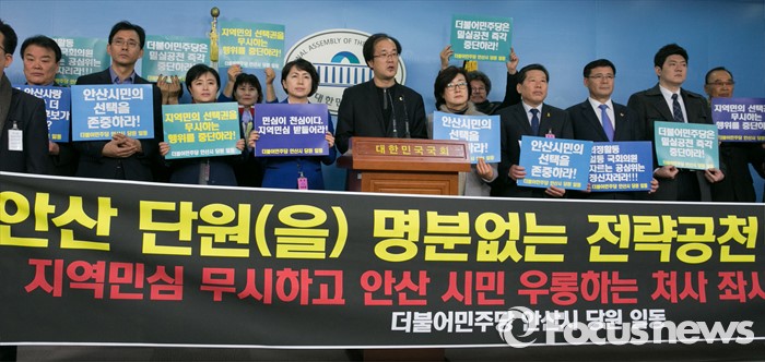 (서울=포커스뉴스) 11일 오후 서울 여의도 국회 정론관에서 더불어민주당 공천관리위원회 2차 공천배제(컷오프) 명단에 포함된 부좌현 의원의 지역구 당원들이 발표 철회를 촉구하는 기자회견을 하고 있다.