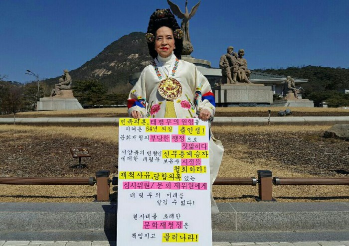 한편 문화재청은 11일 문화재위원회를 열고 이의 신청 내용을 논의할 예정이다.중요무형문화재 제92호 태평무 전수조교인 이현자는 지난 10일 청와대 분수대 앞에서 태평무 보유자 지정 철회를 요구하며 1인 시위를 펼쳤다.<사진제공=이현자>