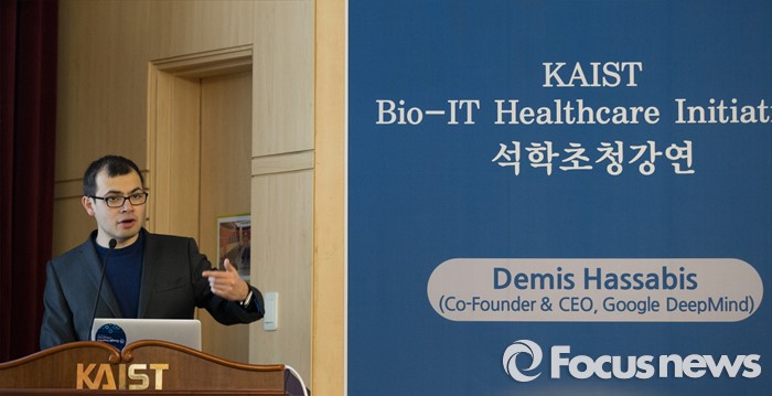 (대전=포커스뉴스) 이세돌 9단과 겨루는 인공지능 컴퓨터 알파고를 개발한 구글 딥마인드 최고경영자 데미스 하사비스가 11일 오후 대전 유성구 한국과학기술원(KIST)에서 '인공지능과 미래' 라는 주제로 강연을 하고 있다.