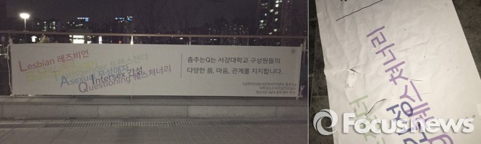 (서울=포커스뉴스) 서강대학교 학생들이 '성소수자 학생들의 입학을 축하한다'는 내용의 현수막을 훼손한 교수를 경찰에 고소했다.