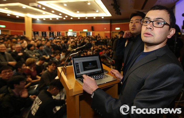 (대전=포커스뉴스) 이세돌 9단과 겨루는 인공지능 컴퓨터 알파고를 개발한 구글 딥마인드 최고경영자 데미스 하사비스가 11일 오후 대전 유성구 한국과학기술원에서 '인공지능과 미래' 라는 주제로 강연을 하고 있다.