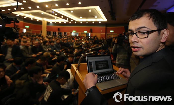 (대전=포커스뉴스) 이세돌 9단과 겨루는 인공지능 컴퓨터 알파고를 개발한 구글 딥마인드 최고경영자 데미스 하사비스가 11일 오후 대전 유성구 한국과학기술원에서 '인공지능과 미래' 라는 주제로 강연을 하고 있다.