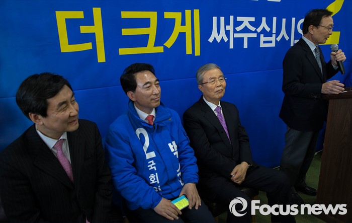 (공주=포커스뉴스) 이해찬(오른쪽 첫번째) 전 국무총리가11일 오후 충남 공주시에서 열린 더민주 박수현 의원의 선거사무소 개소식에 참석, 박 의원의 지지를 호소하며 발언하고 있다.