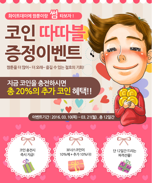 (서울=포커스뉴스) 투믹스의 웹툰 플랫폼 짬툰이 화이트데이를 기념해 '코인 따따블 이벤트'를 실시한다.