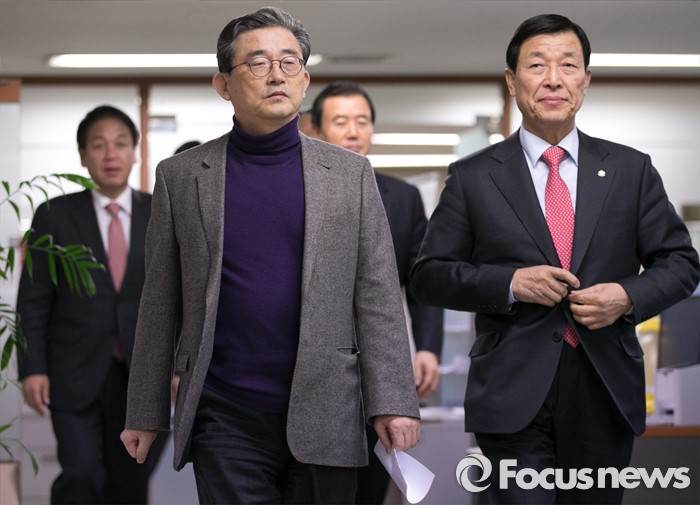(서울=포커스뉴스) 이한구(앞줄 왼쪽) 새누리당 공천관리위원장과 황진하 부위원장 등 위원들이 11일 오후 서울 여의도 당사에서 공관위 내부 갈등 등에 대해 사과하는 내용의 기자회견을 위해 입장하고 있다.