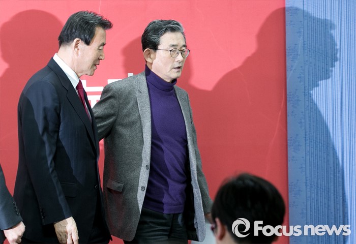 (서울=포커스뉴스) 이한구(오른쪽) 새누리당 공천관리위원장과 홍문표 위원이 11일 오후 서울 여의도 당사에서 공관위 내부 갈등 등에 대해 사과하는 내용의 기자회견을 마친 뒤 퇴장하고 있다.