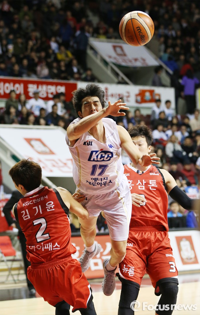 (안양=포커스뉴스) 11일 안양실내체육관에서 열린 2015-2016 프로농구 KGC-KCC 4강플레이오프 3차전에서 레이업슛을 시도하던 KCC 신명호가 KGC 김기윤에 걸리며 볼을 놓치고 있다.