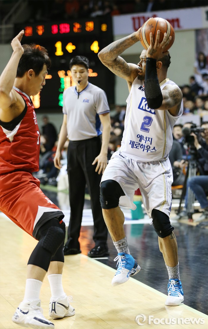 (안양=포커스뉴스) 11일 안양실내체육관에서 열린 2015-2016 프로농구 KGC-KCC 4강플레이오프 3차전에서 KCC 안드레 에밋이 KGC 이정현의 수비를 피하다 사이드라인을 밟고 있다.